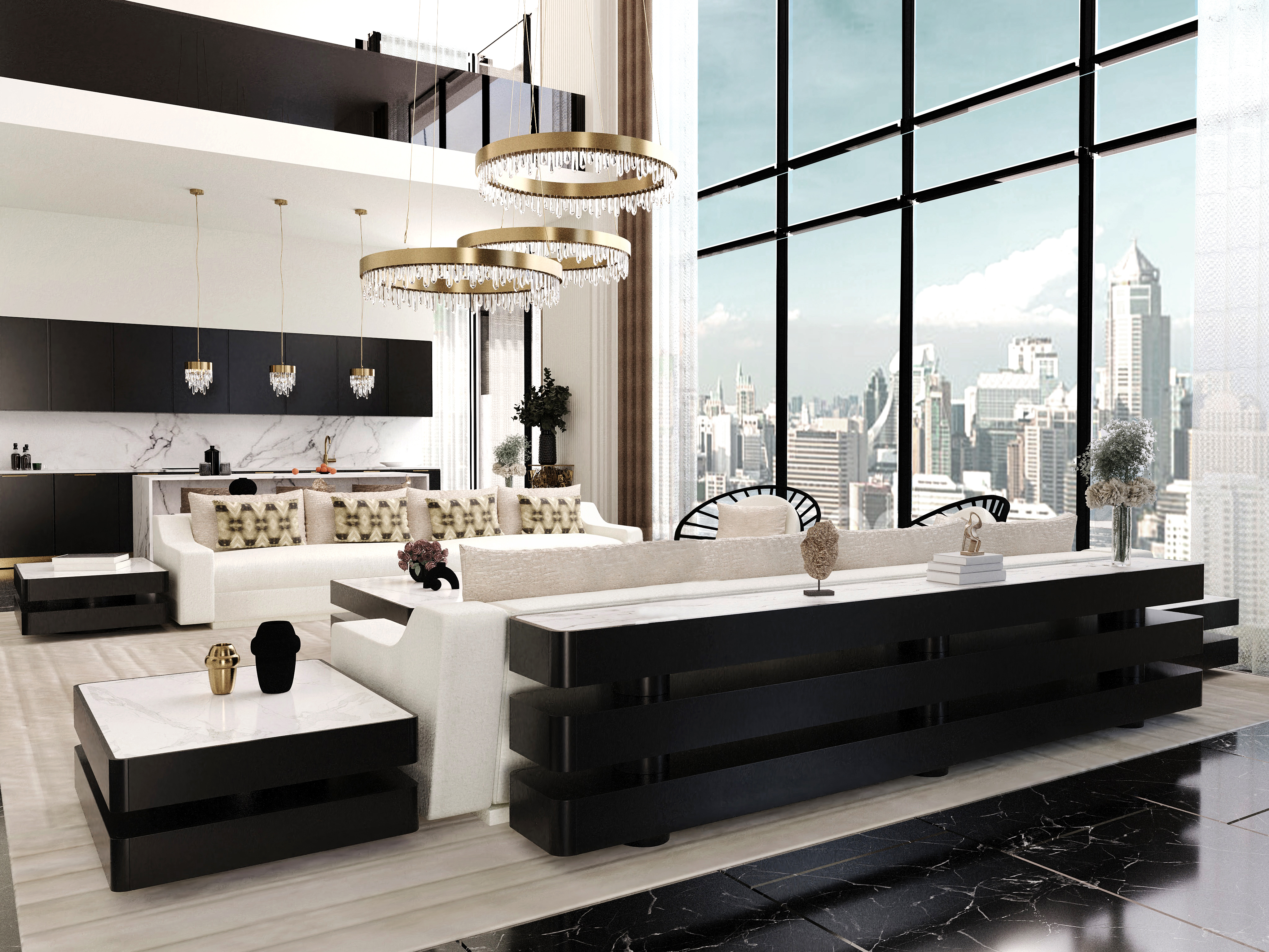 Na sala de estar, a cidade torna-se cenário. A vista ampla reforça a sensação de grandiosidade, enquanto o mobiliário, de volumes generosos, sustenta o convite ao convívio. Mesas centrais em camadas criam dinamismo e organização, e a iluminação decorativa adiciona brilho com sofisticação — nunca com ruído.